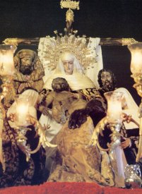 OBSERVACIONES: La Sagrada Mortaja lleva un cortejo penitencial que revive el que tenía en el siglo XVIII como el muñidor que antecede a la cruz de enagüillas, los dieciocho ciriales -número de personas que, según una piadosa tradición, asistieron al entierro de Cristo- y los acólitos tras el paso. El grupo escultórico, uno de los mejores de Sevilla, representa el dolor de María y sus acompañantes por la muerte de Cristo, tras ser descendido de la cruz. |