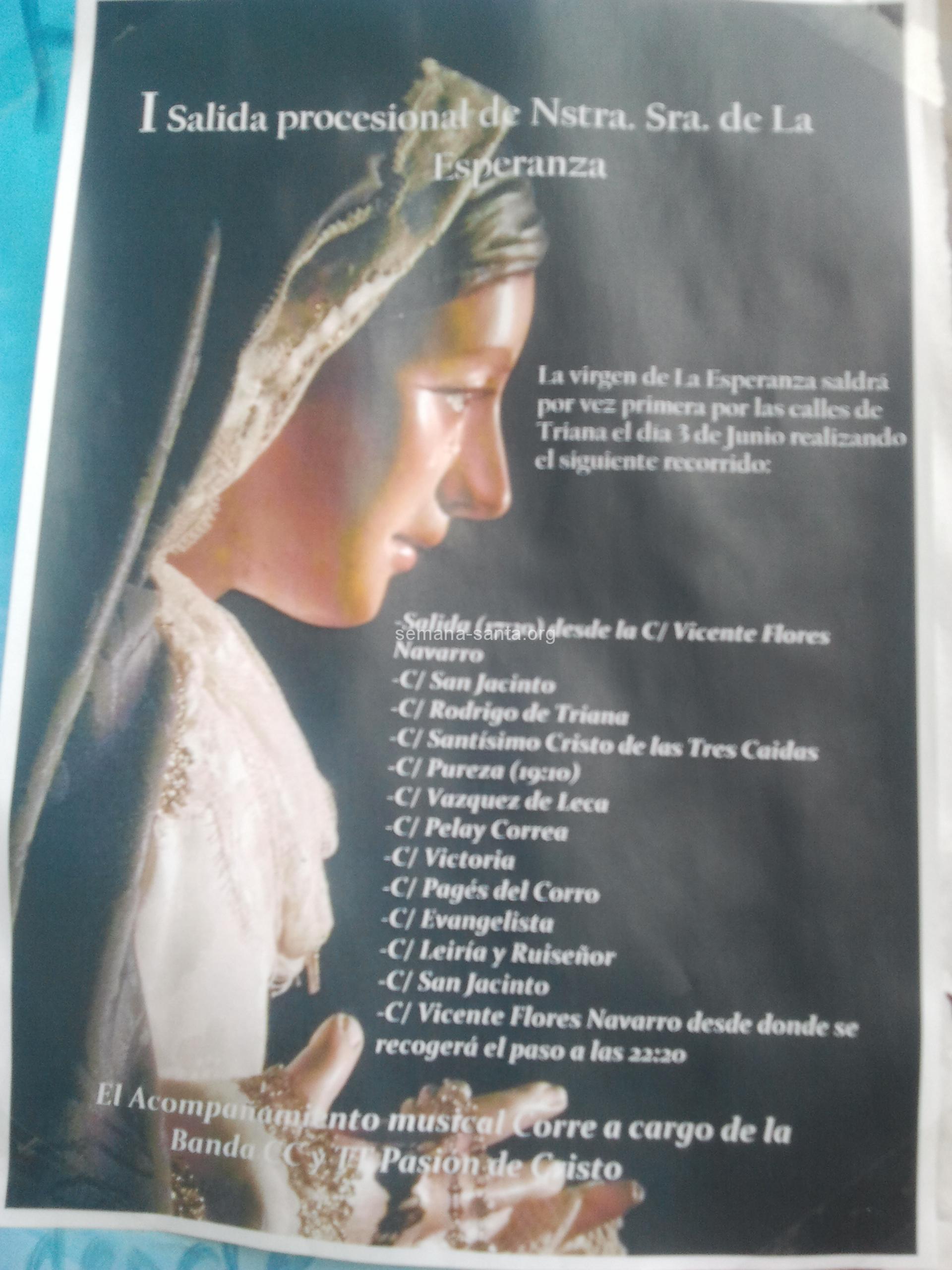 VIRGEN DE LA ESPERANZA (TRIANA). Recorrido: Vicente flores Navarro,(17:30), San Jacinto, Rodrigo de Triana, Santísimo Cristo de las Tres Caídas, Pureza, Vazquez de Leca, Pelay correa, Victoria, Pagés del Corro (20:10), Evangelista, Leiría, Ruiseñor, San Jacinto, Vicente Flores Navarro. Entrada (22,20).